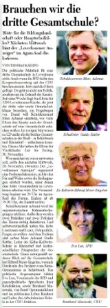Schuldezernent Adomat wird die organisatorischen Rahmenbedingungen erklären. Außerdem werden zwei Praktiker und zwei Politiker das Thema strittig diskutieren. Und selbstverständlich haben Sie, liebe Leserinnen und Leser, Gelegenheit, Fragen zu stellen. Auf dem Podium sitzt neben Marc Adomat Guido Sattler, Leiter der Käthe-Kollwitz-Schule in Rheindorf und leidenschaftlicher Fürsprecher der Gesamtschule. Einen naturgemäß anderen Blick auf die Gesamtschule hat Hiltrud Meier-Engelen, vormals Direktorin des Freiherr-vom-Stein-Gymnasiums in Schlebusch. Das politische Gegensatzpaar bilden Eva Lux, Vorsitzende der SPD und jugendpolitische Sprecherin ihrer Ratsfraktion, sowie Bernhard Marewski, von Beruf Gymnasiallehrer und im politischen Leben Ratsherr und Leiter des Arbeitskreises Schule in der CDU-Fraktion.